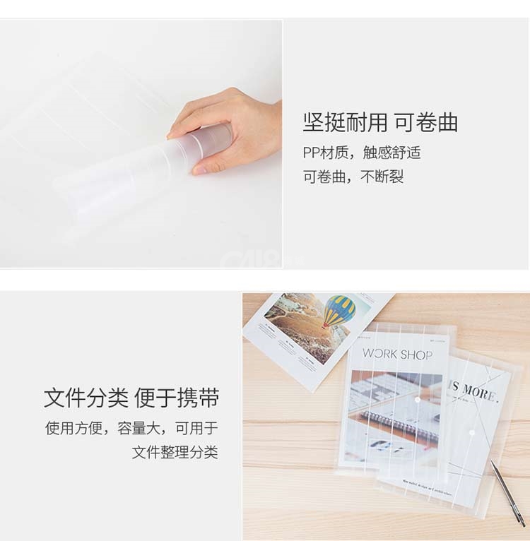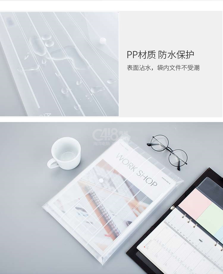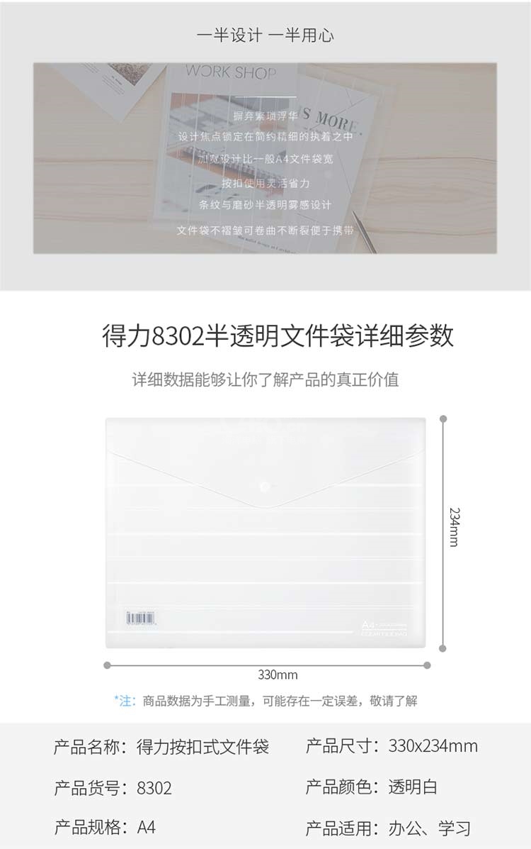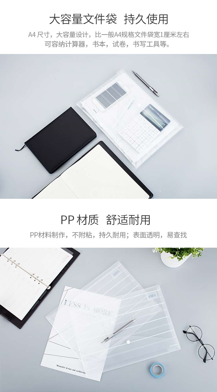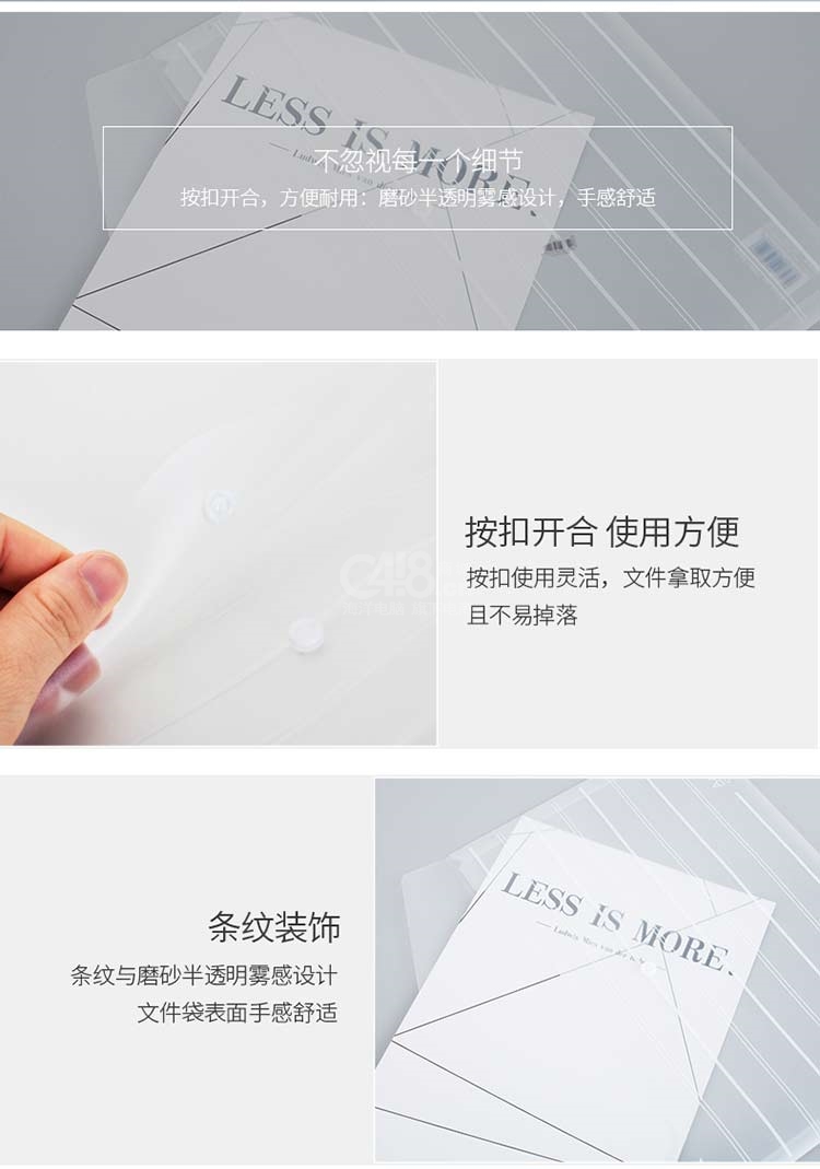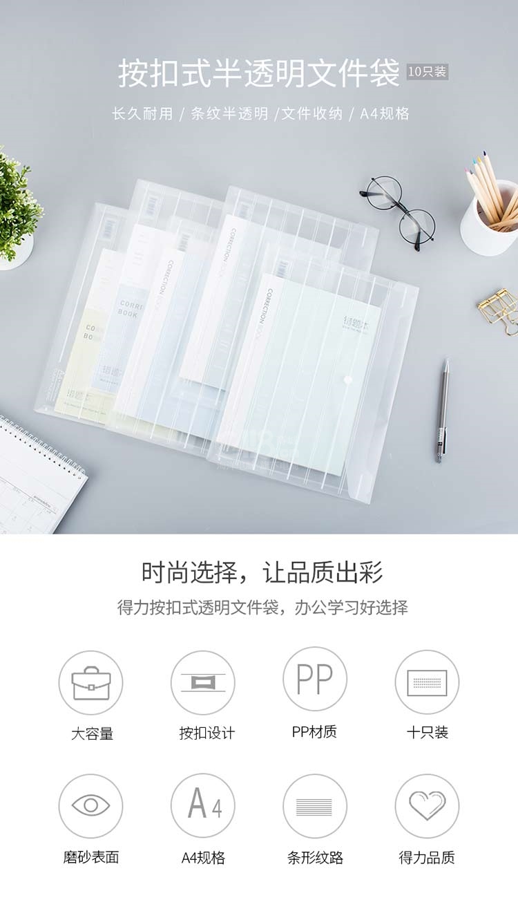 “deli/得力”No.8302 文件袋 單個裝(透明A4加厚磨砂質感條紋資料袋按扣檔案袋學生試卷收納袋10個/包)