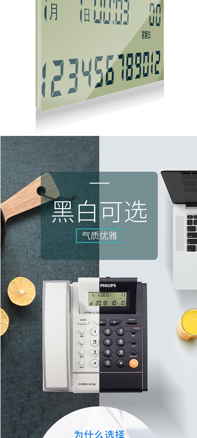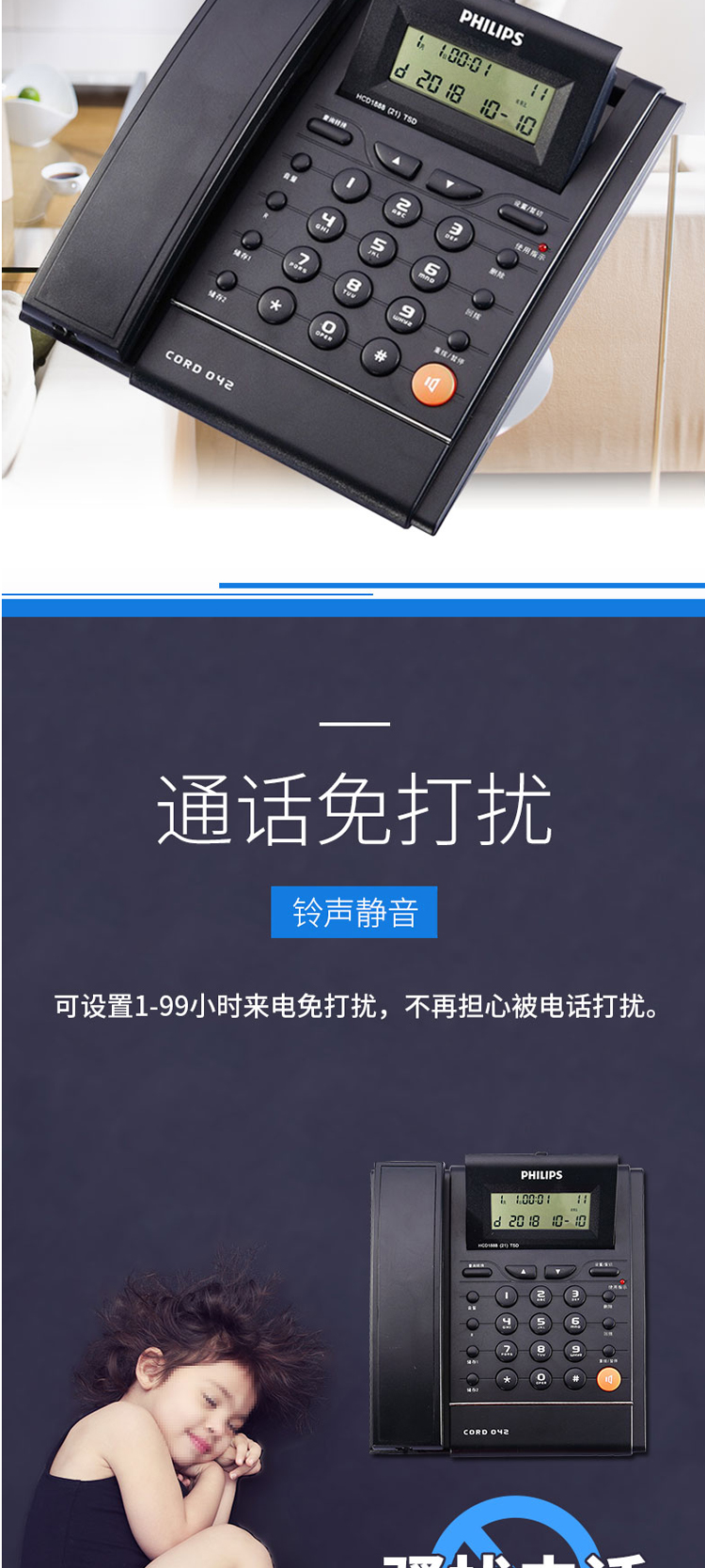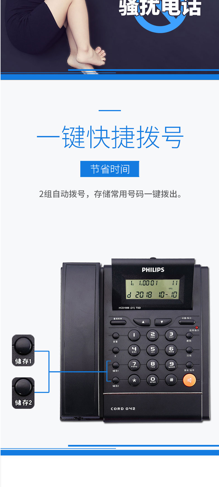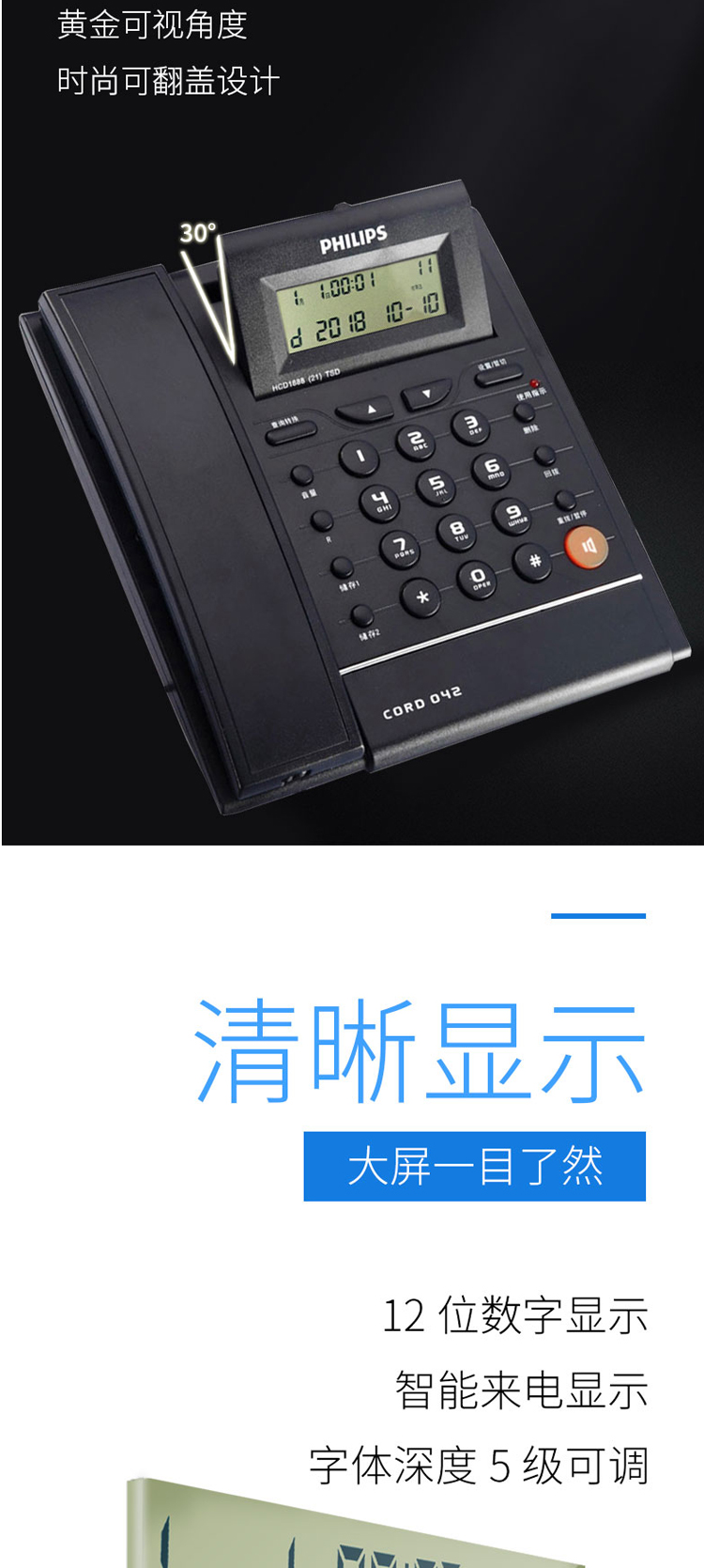 特性 | 飛利浦高品質電話機,兩組一鍵撥號,屏幕可立,方便多角度查看 |
